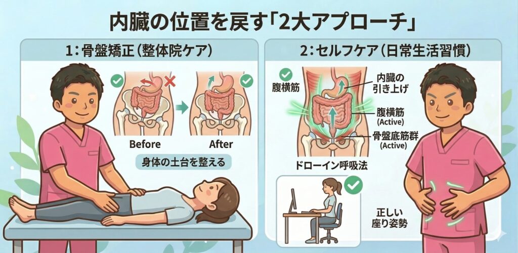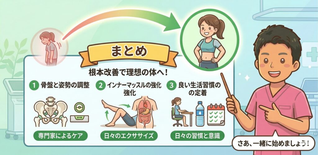ぽっこりお腹がなかなか解消しないとお悩みの方は、脂肪だけでなく「内臓の位置」に目を向けることが大切です。内臓下垂は、日々の不良姿勢やインナーマッスルの衰え、そして何より身体の土台である「骨盤の歪み」が引き金となって起こります。下がってしまった内臓を元の位置に戻すためには、やみくもな食事制限や激しい運動よりも、まずは骨盤という「器」を正しい状態に整えることが最優先です。当院のような専門家のもとで身体の歪みをリセットし、正しい姿勢を身につけることが、ぽっこりお腹を根本から解消する一番の近道となります。ご自身の身体の状態に合わせた適切なケアを取り入れ、スッキリとした健康的なウエストラインを取り戻しましょう。