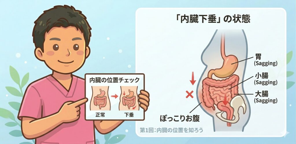 ぽっこりお腹の大きな原因の一つに「内臓下垂」があります。これは胃や腸などの内臓が、本来あるべき正しい位置から下へと垂れ下がってしまった状態のことです。本来、私たちの内臓は筋肉や骨盤によって適切な位置に保たれています。しかし、何らかの原因でその支えが弱くなると、重力に従って内臓が骨盤の空洞部分へと落ち込んでしまいます。行き場を失った内臓が下腹部を内側から圧迫して前に押し出すため、結果として「ぽっこりお腹」として外見に現れるのです。どんなに表面の腹筋を鍛えても、中身である内臓が下がったままでは、根本的な解決にはなりません。